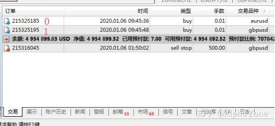 第二個參數是選擇訂單的模式,SELECT_BY_POS是根據訂單的位置編號來選擇訂單,MT4把訂單從上往下依次從零開始編號,如下圖,這個模式就是依據這個編號來選擇訂單,採用這種模式時,第一個參數應該輸入訂單的位置編號。第二種模式是SELECT_BY_TICKET,這個模式是根據訂單號碼來選擇訂單,就如下圖的215325180號訂單,這個號碼就是第一個參數應該輸入的數字。