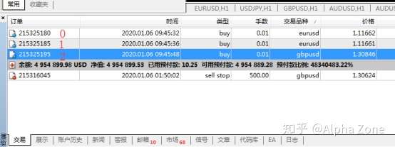 void OnStart() { int i; string sym= "EURUSD"; int huadian=10; int check; for(i=0;i=<OrdersTotal()-1;i++) { if(OrderSelect(i,SELECT_BY_POS)) { if(OrderSymbol()==sym && OrderType()==OP_SELL) { check=OrderClose(OrderTicket(),OrderLots(),MarketInfo(sym, MODE_ASK),huadian); } else if(OrderSymbol()==sym && OrderType()==OP_BUY) { check=OrderClose(OrderTicket(),OrderLots(),MarketInfo(sym, MODE_BID),huadian); } } } } 我們再試一下程序的效果。如下圖所示,現在有三個訂單,兩個歐美的單子和一個鎊美的單子,按MT4的編號那麼兩張歐美的單子編號分別是0和1,鎊美編號是2,現在從上往下循環平掉歐美的訂單。當i=0時,程序選中了一個單子,確實是歐美的單子,平掉了,結果很好,然後再往下走,i變成了1,接下來我們要選中的是編號為1的單子看看是不是歐美的單子。就在這個時候我們發現,由於之前我們選中的0號單子被平掉了,原來的1號單子變成了現在的0號單子,而原來的2號單子變成了現在的1號單子,於是我們選擇的1號單子就成了鎊美的單子,於是一個循環下來,我們發現我們只平掉了一個歐美的單子,另外一個單子沒有平掉。