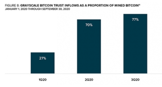 與此同時,Grayscale購入比特幣的速度也在加快。該公司的比特幣信託在第三季度買入所有新挖礦比特幣的77%(7.193億美元),比第二季度增加了7%。