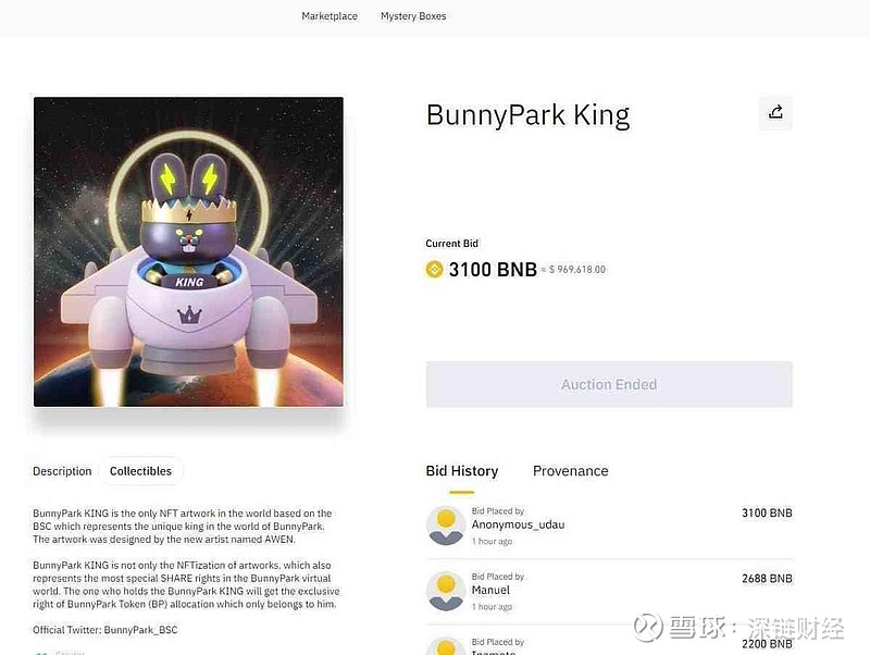 其中BunnyPark 的NFT 作品「The KING」的拍賣初始價格為1000 BNB,但最終以3100 BNB 被幣安用戶Anonymous_udau 拍得,按當前BNB 340來美元計算的話,這筆交易金額達685萬美元,創下Collectible類別的拍賣歷史最高紀錄。