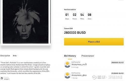 拍賣:BINANCE NFT 聯合波場TRON、APENFT 基金會舉行了主題為“Genesis”的首次拍賣會,並選擇安迪·沃霍爾《三幅自畫像》的NFT作品為本次拍賣會主要拍品,在開拍的10分鐘之內,以252萬美元的競價迎來開門紅,並最終以280萬美元成交。