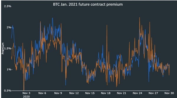 從數據走勢來看,過去一周顯然經歷了“過山車”式的震盪,比特幣兩月期貨溢價率指標在11月24日達到2%,當時比特幣價格很快飆升到19434美元的峰值。之後比特幣兩月期貨溢價率下跌到1.1%,伴隨而來的價格下跌14%,但需要注意的是,雖然兩月期貨溢價率下跌到1.1%但該指標仍保持在0.8%以上。這意味著,投資者依然認為當前市場水平是看漲的,結果也如預期,我們看到比特幣價格在11月30日獲得了新的高點19,850美元。