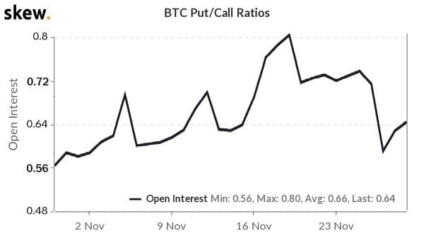 上圖展示了比特幣期權看跌-看漲交易率走勢,資料來源:Skew.com。