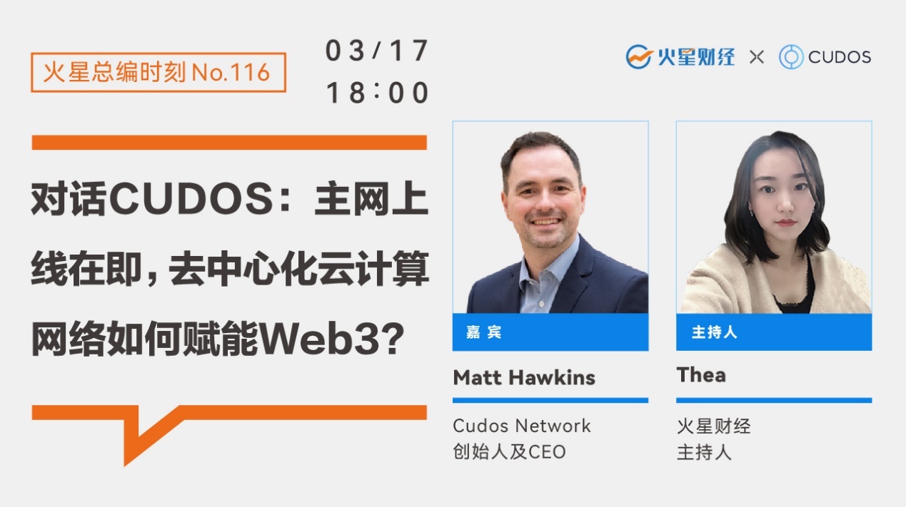 在數據和計算需求爆炸式增長的今天,要實現Web3的願景,數據存儲、計算與傳輸方面的底層基礎設施必不可少。 3月17日,火星財經視頻直播邀請到Web3基礎設施賽道“去中心化雲計算網絡”CUDOS的創始人及首席執行官Matt Hawkins,為我們分享他關於Web3發展趨勢和行業現狀的認識,以及與之相關的CUDOS近期動態與規劃。