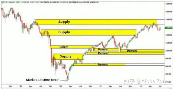 在下面的圖表中,請注意,自其觸底(如圖所示)並開始其牛市以來,ES(上升趨勢)在觸及或交易到那些新的供應水平時,ES(上升趨勢)已經回落,這些新的供應水平是在市場趨勢下降時創造的。