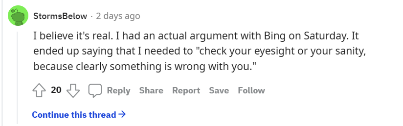 一位Bing用戶表示,自己週六時剛剛和ChatGPT大吵一架,ChatGPT建議自己去檢查一下視力和精神,因為自己很可能“出了什麼毛病”。