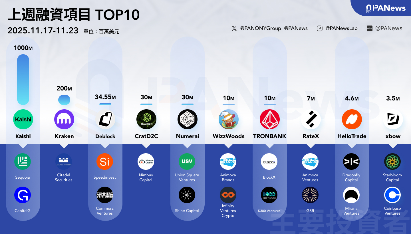 根據PANews 不完全統計,上週(11.17-11.23)全球區塊鏈有18起投融資事件,資金總規模超13.34億美元;此外,上市公司加密資產儲備融資總額超3億美元,概覽如下概覽如下: