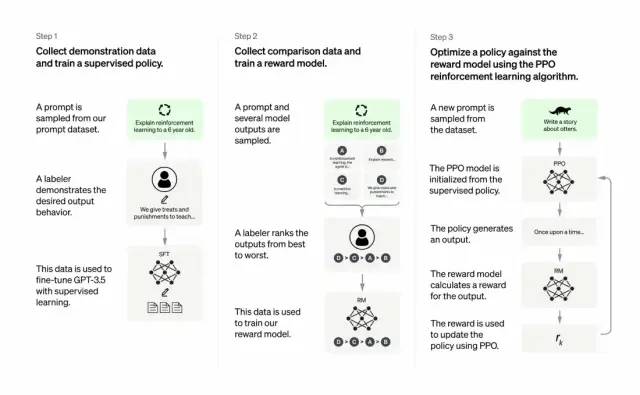 總體來說,Chatgpt和上文的InstructGPT一樣,是使用RLHF(從人類反饋中強化學習)訓練的。不同之處在於數據是如何設置用於訓練(以及收集)的。 (這裡解釋一下:之前的InstructGPT模型,是給一個輸入就給一個輸出,再跟訓練數據對比,對了有獎勵不對有懲罰;現在的Chatgpt是一個輸入,模型給出多個輸出,然後人給這個輸出結果排序,讓模型去給這些結果從“更像人話”到“狗屁不通”排序,讓模型學習人類排序的方式,這種策略叫做supervised learning,本段感謝張子兼博士)
