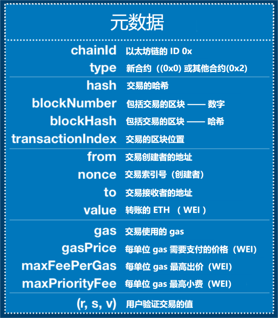 元数据(metadata),包括发送/接受的 ETH 金额、gas 详细信息以及签名数据