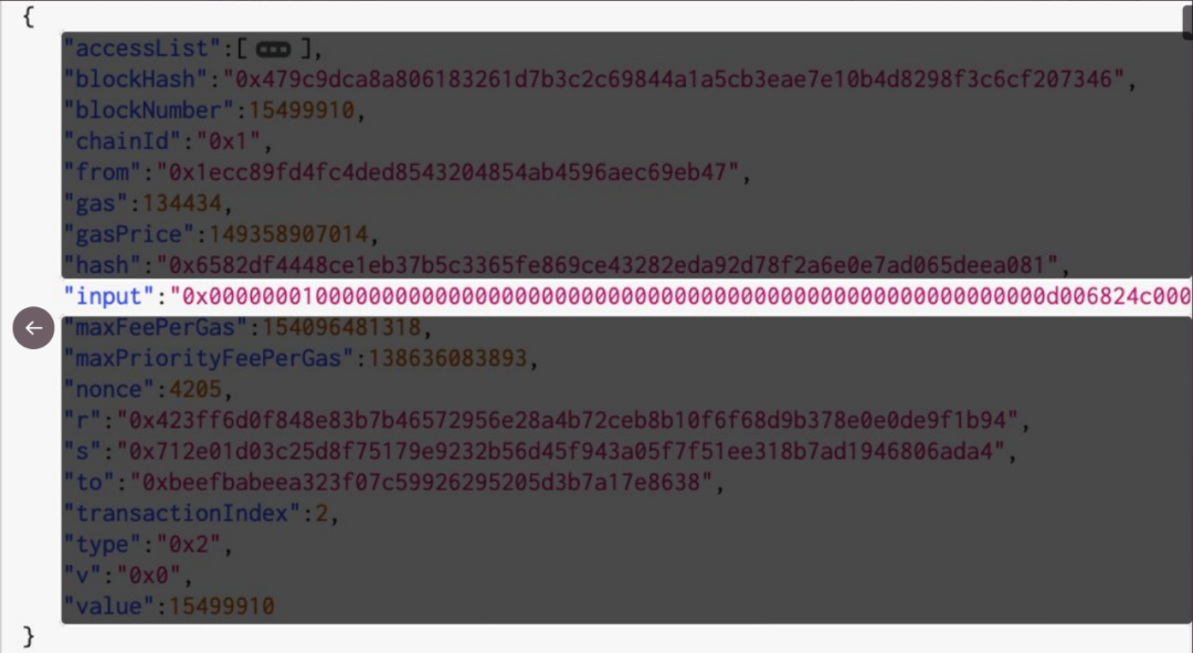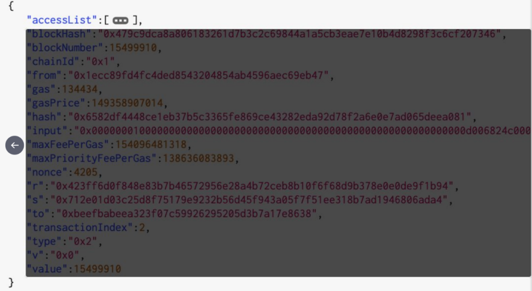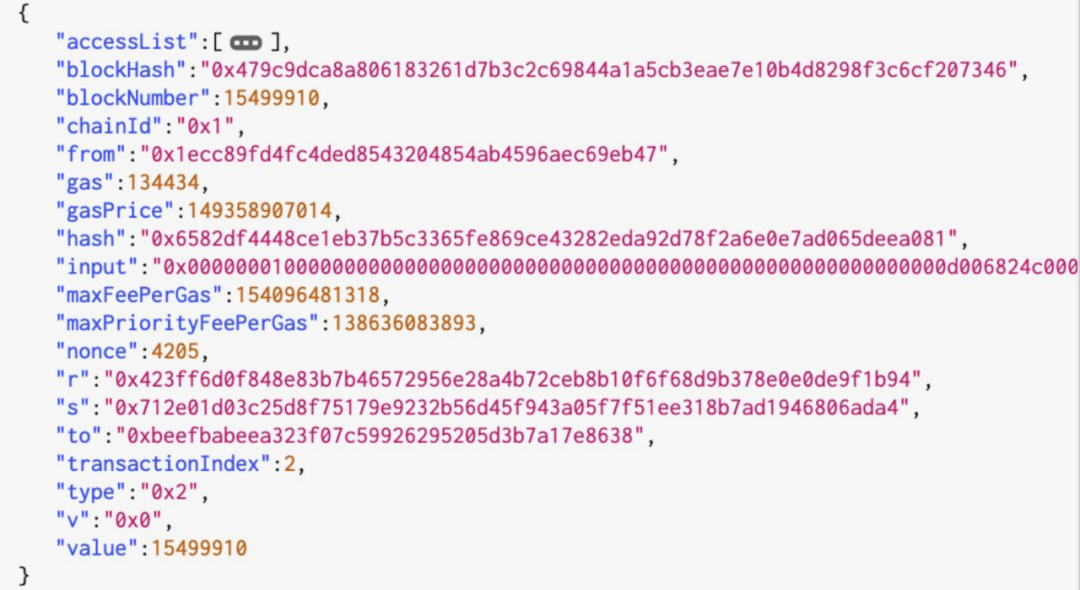 type —— 这里有两种类型:一个新的合约(0x0)还有其他所有合约(0x2)。EIP-2718 提出了一个封装功能(0x2),让更多不影响以太坊核心规范的类型得以使用。