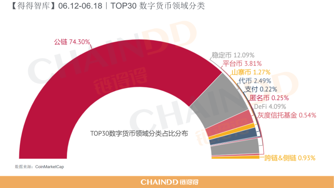 本週市值TOP 30的數字貨幣分為公鏈、平台幣、穩定幣、代幣、DeFi等領域。