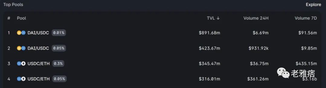 總的來說,以太坊主網上ETH和USDC之間的swap通過0.3%或0.05%的池進行,通常情況下是後者,因為其費率較低,但前者也仍然獲得了相當數量的交易量。此外還有1%的費率池,儘管其TVL和swap交易量大幅降低。
