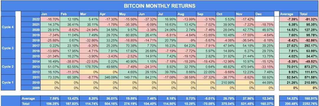 比特幣的月度和年度表現能給我們帶來什麼啟示?在過去的13年裡,比特幣價格大部分時間都在上漲,在此期間的平均月回報率為14.32%。