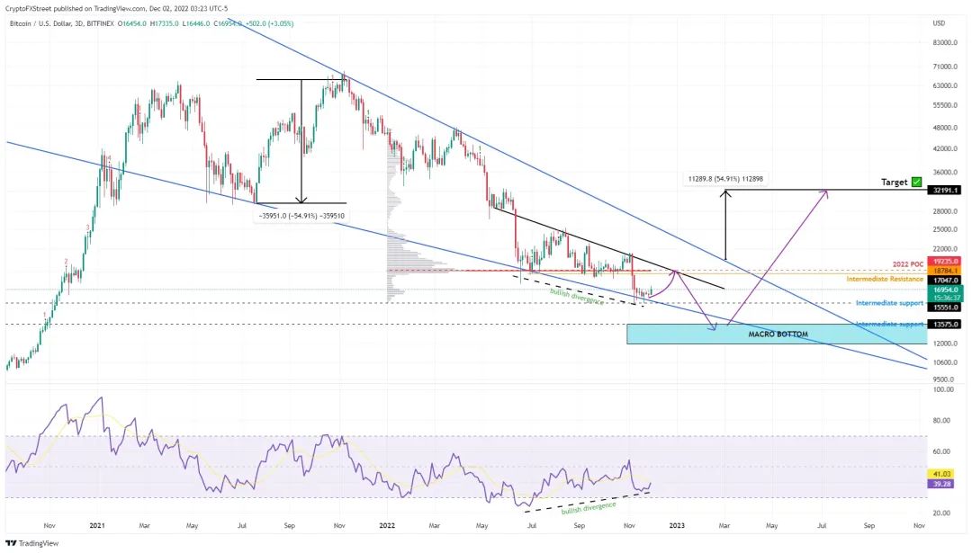 然而,失去15,550美元的支持水平將創造一個較低的低點,並使賠率偏向熊市。這種看漲前景的失效可能引發另一個比特幣價格拋售到潛在的宏觀底部區域,從13,575美元延伸到11,898美元。