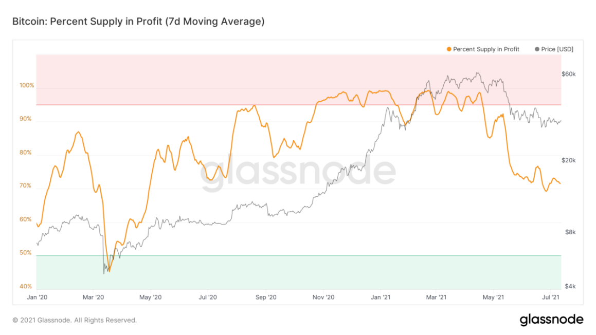 PAData 7月12日消息,近期BTC盈利筹码占比持续下跌,根据glassnode的数据,截至7月11日,BTC盈利筹码占其总流通量的比重(MA 7,最近7天均值)约为71.52%,较年初的99.08%已大幅下降约28个百分点。当前,BTC盈利筹码的占比均处于年内低位,相当于回到去年4月下旬的水平。