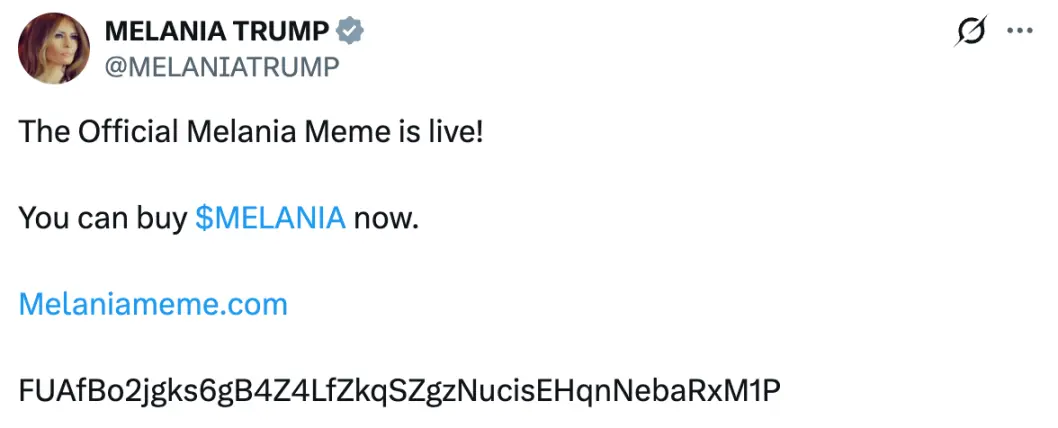 年初美国新任总统特朗普发行 Meme 币 TRUMP 的事情可谓人尽皆知,之后特朗普夫人梅拉尼娅与阿根廷总统米莱也先后于北京时间 2025 年 1 月 20 日和 2 月 15 日在个人社媒上宣传与他们有关的 MELANIA 与 LIBRA 代币(米莱发布的推文已删除)。