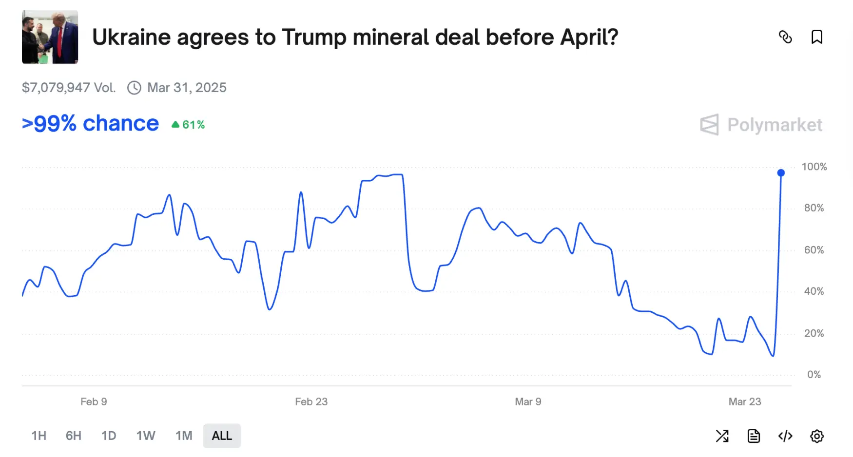 北京时间 2025 年 3 月 25 日,因美国总统大选红极一时的 Polymarket 上出现了一起预言机攻击事件。在「乌克兰是否会在 4 月之前同意特朗普的矿产协议」市场中,随着时间越来越接近截止日期,「Yes」的概率已经接近于 0,但却在 3 月 25 日晚突然反转,「Yes」的概率直接升至 100%。