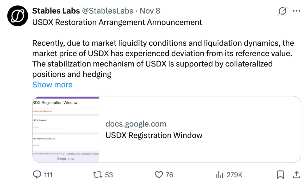 更可怕的是,两个可疑地址中有一个与 USDX 发行方 usdx.money 创始人 Flex Yang 直接相关,创始人都在着急套现,除了项目已经出现问题,还有其他解释吗?就在笔者文章发出后的当晚,USDX 开始出现严重的脱锚,验证了项目确实出现了问题的论断。之后的 11 月 8 日,Stables Labs 发推称将根据现有资源情况帮助受损失的用户,并开放了登记渠道,但这也是 Stables Labs 至今为止的最后一条推文,实质进展如何,我们不得而知。