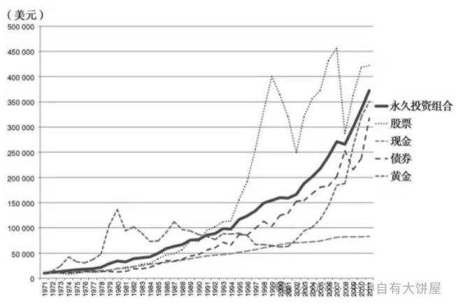 下图表明了这套永久投资组合分别对比股票,现金,债券,黄金的收益情况对比,可以看到非常稳定,涨幅虽然比不过股票,但是它回撤更小。
