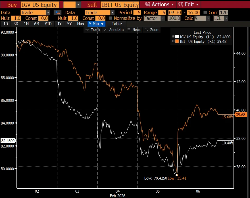 第一,比特币的这轮抛售,很可能触及了某类并非纯加密原生的多资产投资组合或策略。这既可能是前文提到的多策略对冲基金,也可能是类似贝莱德的模型投资组合业务那样,在 IBIT 与 IGV(软件类 ETF)之间进行配置,并在剧烈波动下被迫进行自动再平衡的资金。