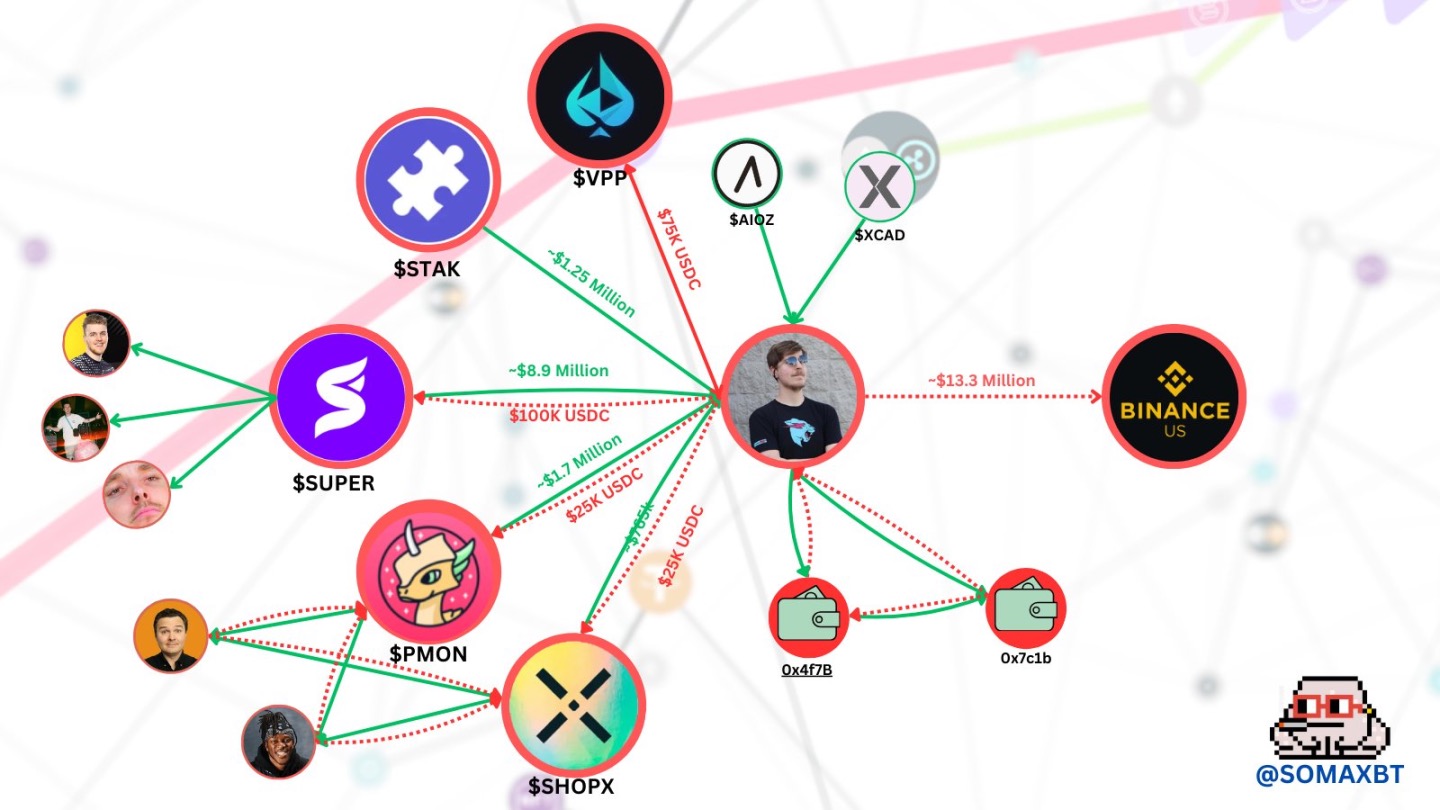 据 SomaXBT 称,MrBeast 向该项目投资了 10 万美元,并获得了 100 万个 SUPER 代币作为回报。在他投资之后,代币价格飙升,MrBeast 于 2021 年 3 月 30 日将其 SUPER 代币转移到一个备用钱包,在那里,这些代币被通过一系列交易抛售,总计 1,900 ETH(当时约合 370 万美元)。MrBeast 根据一份归属合同获得了额外的 SUPER 代币,随后他又以 550 万美元的价格将其出售,使他从该项目中获得的总收入达到约 900 万美元。
