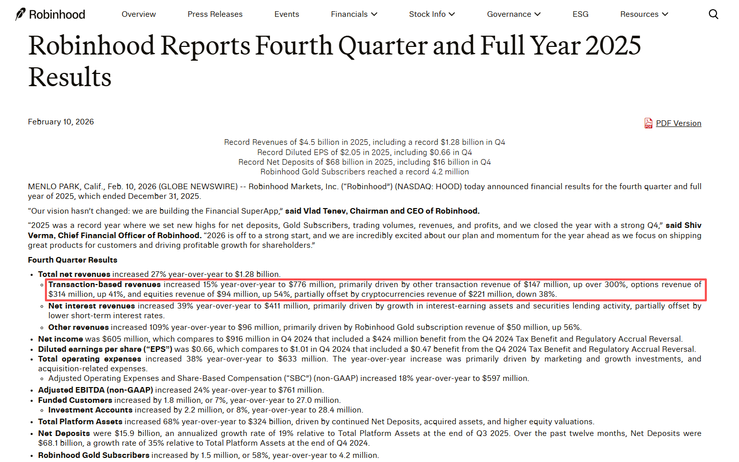 Robinhood:一座没有赌徒的豪华赌场,其财报充满了魔幻现实主义色彩。如果你只看上半部分,这是一家处于巅峰的金融科技巨头:2025全年营收45亿美元创历史新高,净利润19亿美元,Gold会员数激增58%达到420万。CEO Vlad Tenev在电话会上自信地宣称:“我们要建立的是金融超级App。”