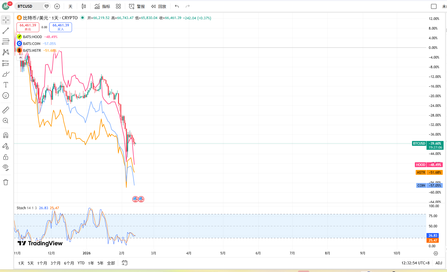 MicroStrategy(MSTR)的Q4财报也佐证了这一点——单季因比特币减值导致账面亏损124亿美元。无论是直接持有比特币的MSTR,还是提供交易服务的HOOD和COIN,它们的股价走势图与比特币K线图的重合度依然高达90%以上。这是一种“虚假的多样性”。 无论你有多少个业务条线(Robinhood声称有11个年入过亿的业务),只要最核心的那个叙事——Crypto Adoption熄火,市场的估值体系就会迅速坍塌。