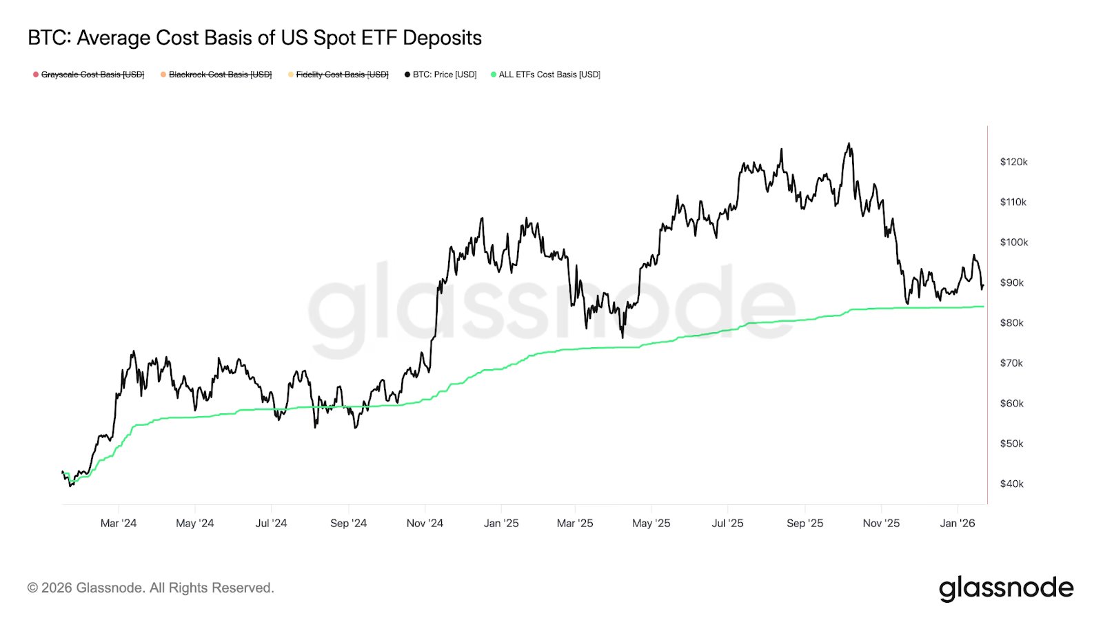 • 现货ETF吸金火爆: 机构通过现货ETF接入比特币市场成为主流手段,并且ETF数据也是窥探市场热度的手段之一。比如,根据SoSoValue数据显示,美国现货比特币ETF在1月底出现自去年11月以来最大规模单周资金流出(约12.2亿美元),而历史经验显示,大规模赎回往往发生在价格阶段性底部附近,因此当前比特币可能接近局部低点。下图数据表明,ETF投资者的平均持仓成本约为84,099美元,这一价格区间过去多次形成关键支撑位,若历史模式重演,本轮资金外流或意味着短期下跌动能接近尾声,市场存在反弹可能。