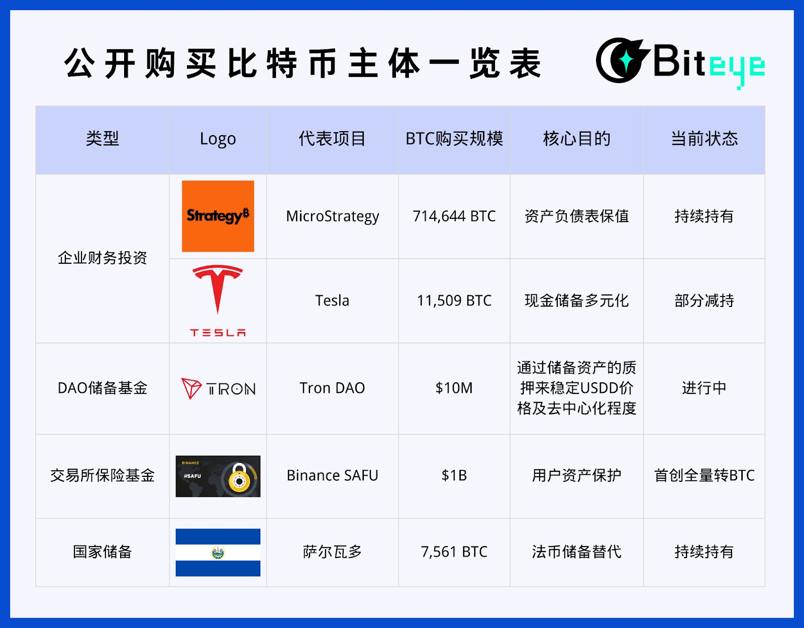 截至 2026 年初,历史上以"建设市场、稳定生态或储备资产"为目的公开购买比特币的项目可分为5大类,以下是几个表性案例: