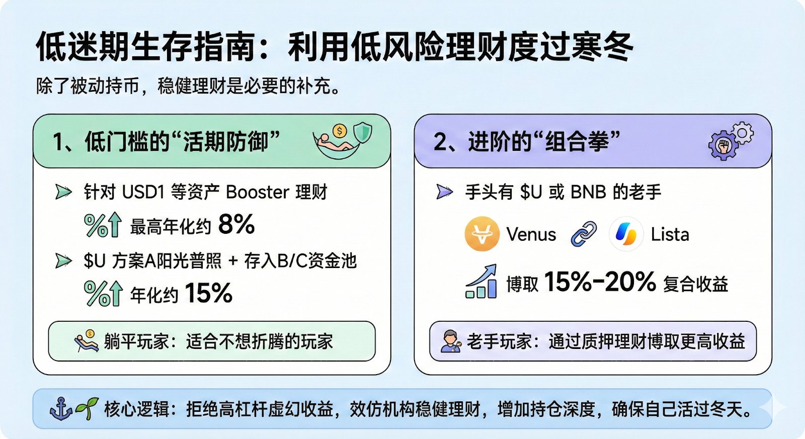 在当前的低迷期,除了被动持币,利用平台活动进行低风险理财是度过寒冬的必要补充。以近期币安的理财动作来看,逻辑非常清晰: