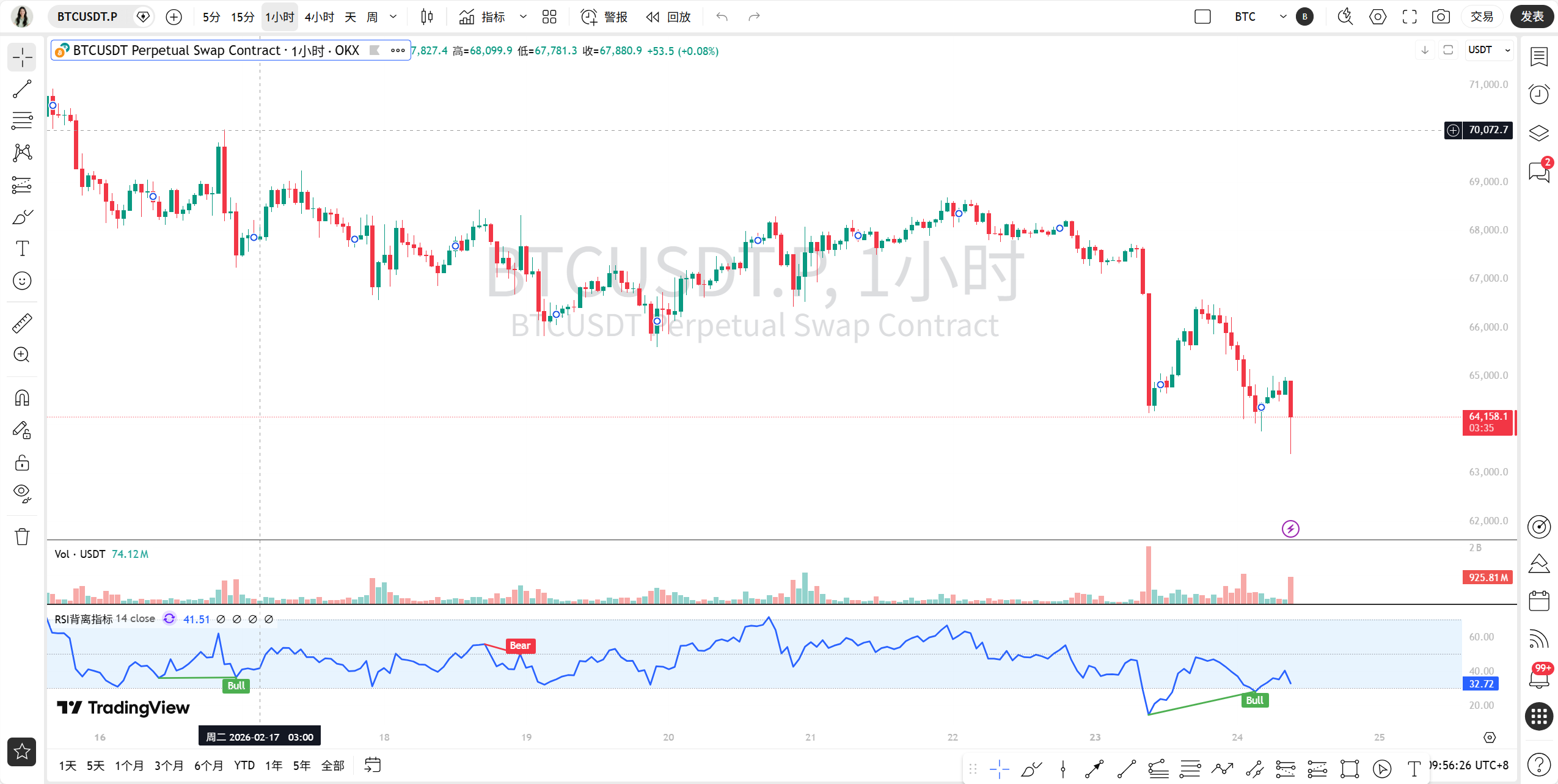 日线图可就有点意思了!虽然从1月底以来,比特币经历了一波大幅的下跌,价格从高位一路跌到当前的64000美元附近,但咱们仔细瞧,日线级别的MACD指标竟然出现了金叉!DIF线从DEA线下方穿越上去了,MACD柱子也开始由负转正,这可不是一个简单的小信号哦!虽然DIF和DEA都还在零轴下方,说明大趋势的下跌惯性仍在,但这个金叉啊,往往预示着一波像样的反弹或者说是趋势逆转的早期信号。再加上日线RSI也处于超卖区域,从经验来看,这种技术背离式的金叉和超卖,通常是市场内在技术性反弹需求积累到一定程度的表现。所以呀,长期来看,虽然大方向还是弱势,但短期内出现一个强劲反弹的可能性正在增加。