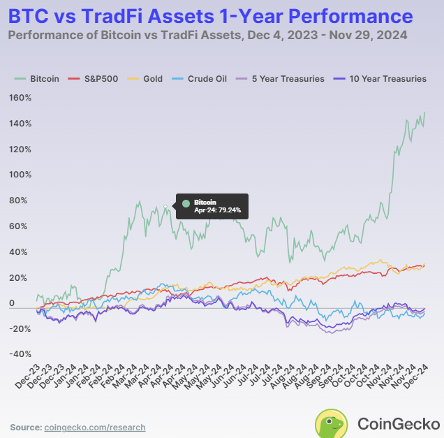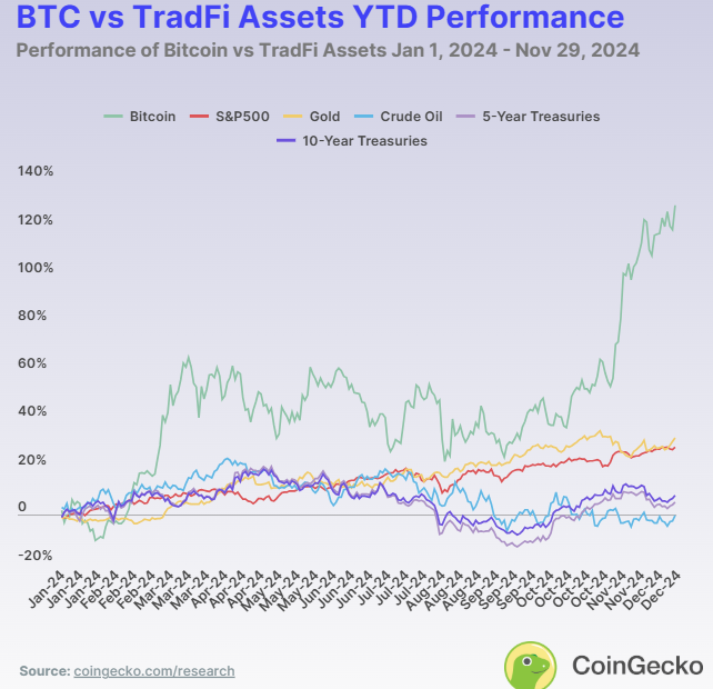 2026 年的表现与 2024 年截然不同,作为参考,以下为 2024 年比特币与其它资产类别的表现(发布于 2024 年 12 月)。