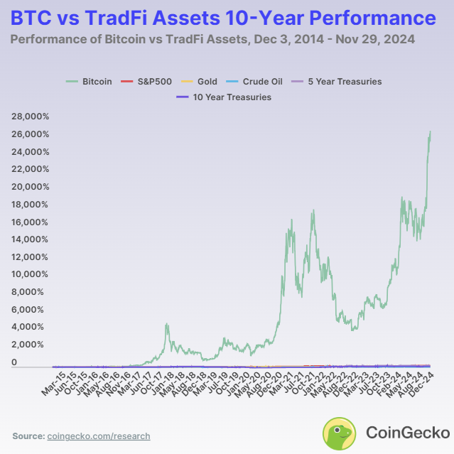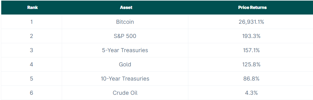 从长达十年的时间跨度来看,比特币的增长率达 26,931.1%,无人能及,这充分证明了它对早期投资者的巨大投资潜力。尽管其他资产的回报率远不及比特币,但它们仍然能够提供稳定的收益,例如标普 500 指数的回报率为 193.3%,黄金的回报率为 125.8%。美国国债也维持着价值,五年期国债的回报率为 157.1%,十年期国债的回报率为 86.8%。然而,原油的回报率仅为 4.3%,表现远逊于其他资产。