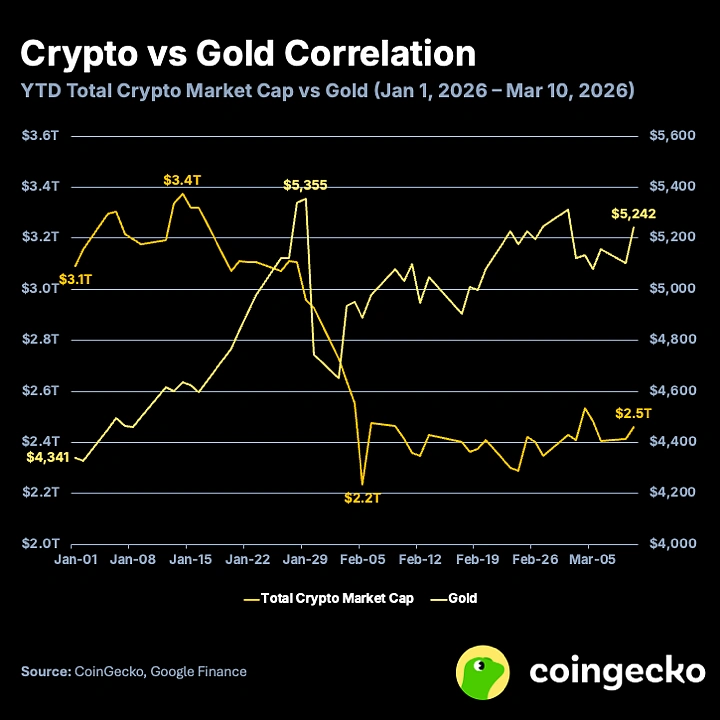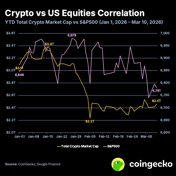 2026 年至今加密货币与标普 500 及黄金仅显示出中度相关性,或许是资产类别最终开始“脱钩”的信号。