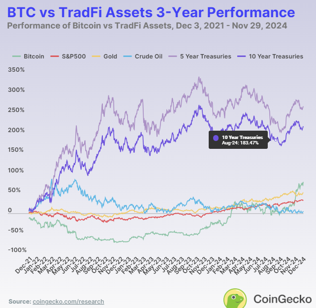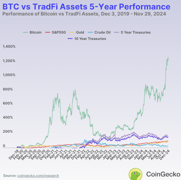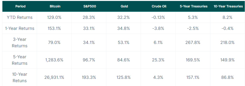 不同时间跨度的表现揭示了每种资产的优劣势。在 2024 年,比特币是表现最好的资产,回报率为 129.0%。黄金紧随其后,年初至今回报率为 32.2%,展示了其作为传统价值储存手段的可靠性。标普 500 指数保持强劲,回报率为 28.3%。然而,原油价格下跌,回报率为 -0.13%,而美国国债提供了适度的回报,5 年期国债为 5.3%,10 年期国债略高,为 8.2%。