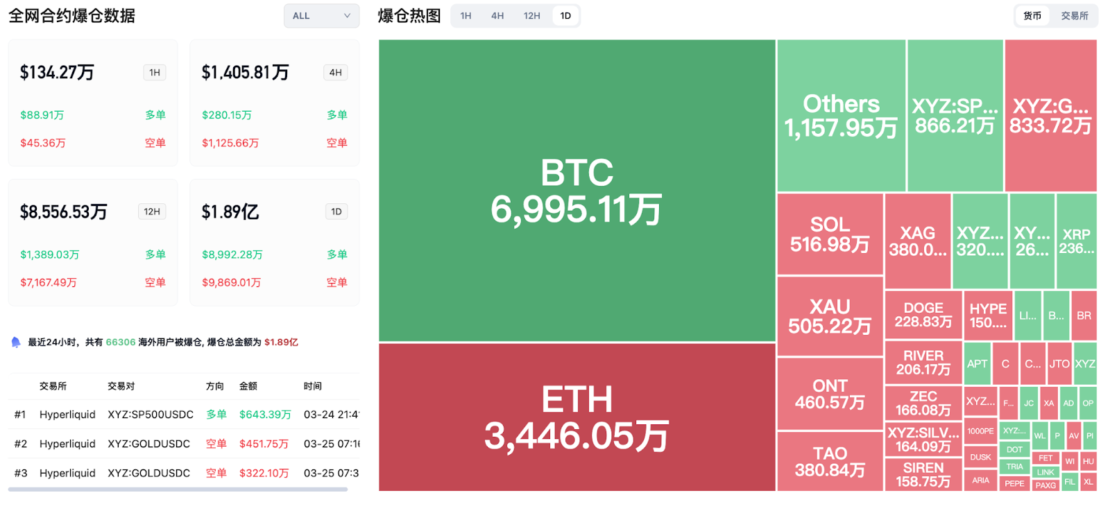24小时爆仓数据:全球共65308人被爆仓,爆仓总金额为21.89亿美元,其中BTC爆仓6995万美元、ETH爆仓3446万美元、SOL爆仓516万美元。