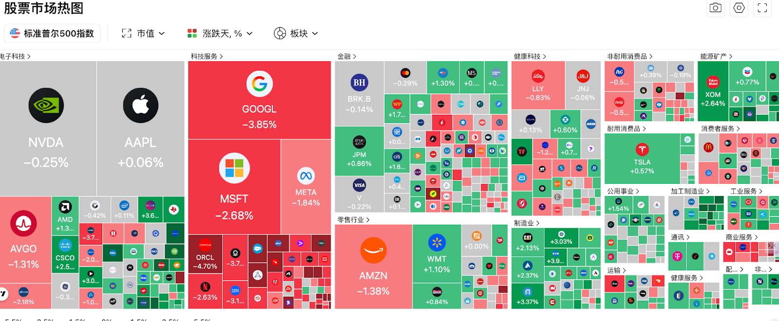 个股方面,甲骨文(Oracle)较9月高点回撤超50%,赛富时(Salesforce)大跌超6.5%,ServiceNow跌近6%,微软下挫近3%。过去六周内,谷歌、Meta和IBM等多家科技巨头均出现10%以上跌幅,市场对AI板块的盈利能力及高估值的担忧加剧。