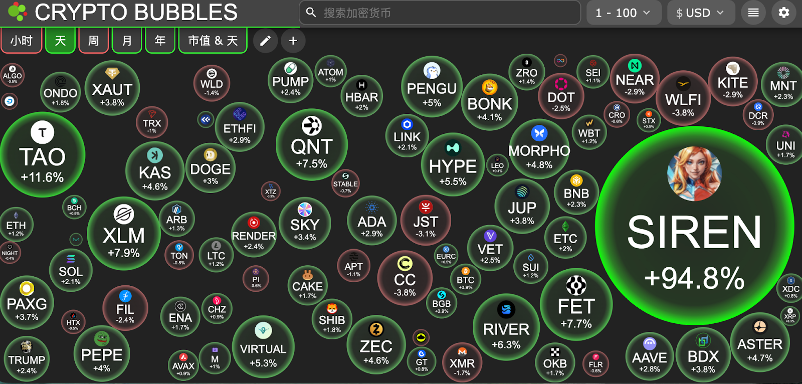 今日市值前100币种最大涨幅:Siren涨97.5%、Bittensor涨11.6%、Stellar涨8%、ASI Alliance涨7.5%、Quant涨7.4%。