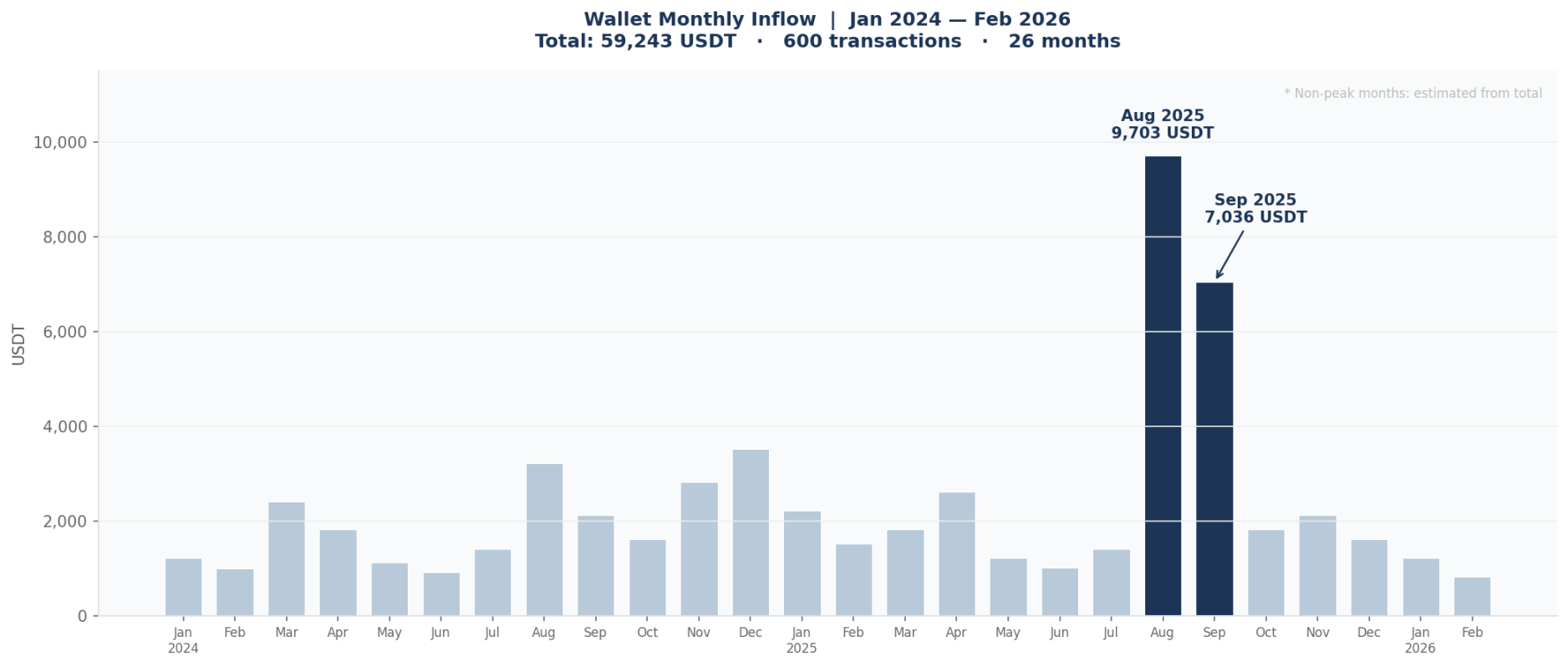于是我转而在链上查他给我的 TRON 链收款地址,这个地址从 2024 年 1 月开始运作,至今累计流入超过59,243 USDT,共 600 笔收入交易,横跨 26 个月。但净留存是零。
