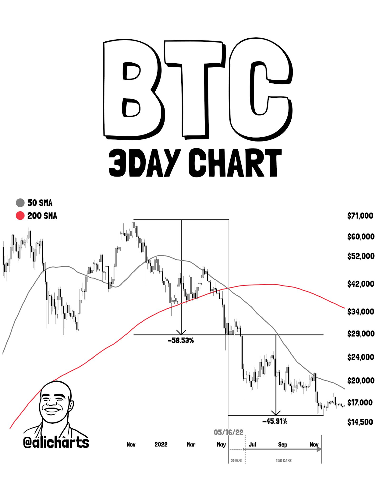 2022年周期:在5月出现交叉之前,价格已经下跌了50%。整整33天后,市场又下跌了45%,提供了一个绝佳的买入机会。然而,156天后形成了另一个更低的低点,完成了熊市结构,并为下一轮牛市打开了大门。