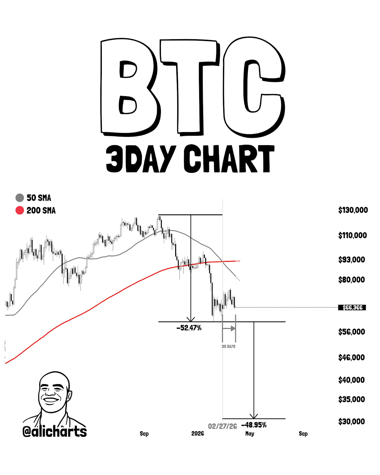 在2025年10月的高点之后,Bitcoin已经经历了52%的回调。在2026年2月27日,我们再次看到了3日SMA交叉。截至今天,我们进入这个信号整整30天了。