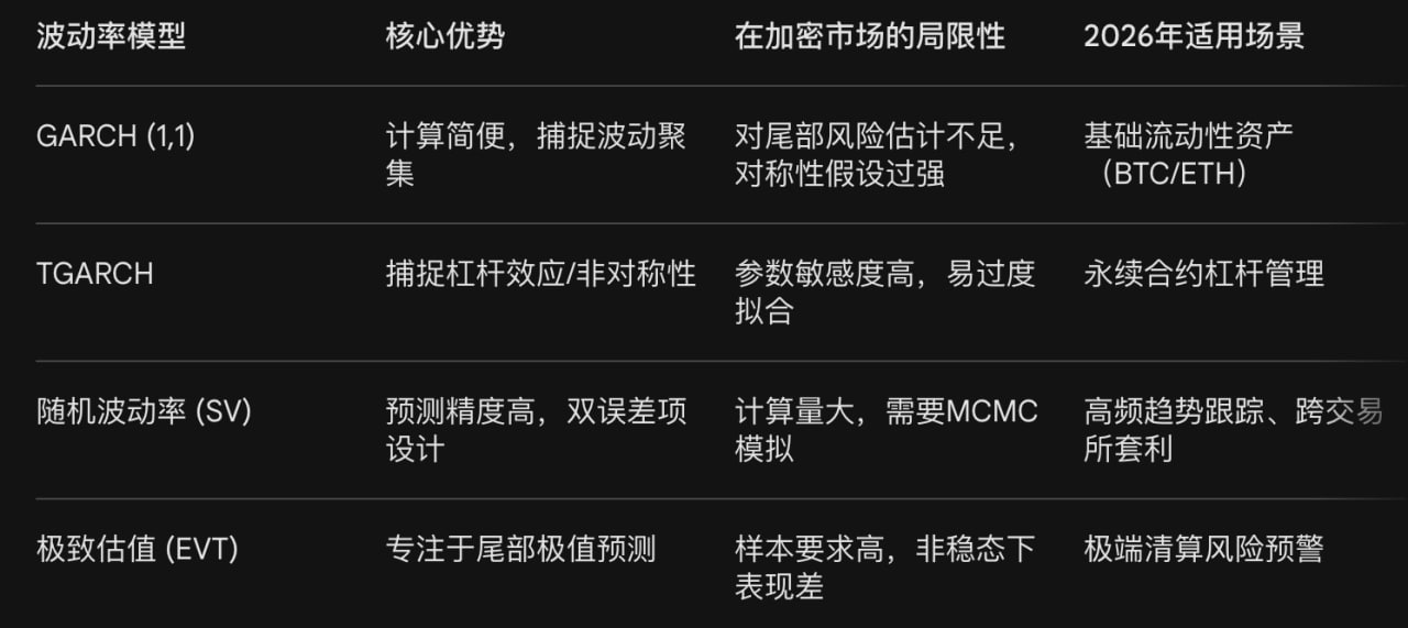 波动率管理是加密CTA策略的灵魂。传统的GARCH模型因假设波动率仅由单一误差项驱动,在处理加密资产的非对称性(即“坏消息”引发的波动通常大于“好消息”)时往往失效。2026年的前沿策略更多采用随机波动率(SV)模型 。