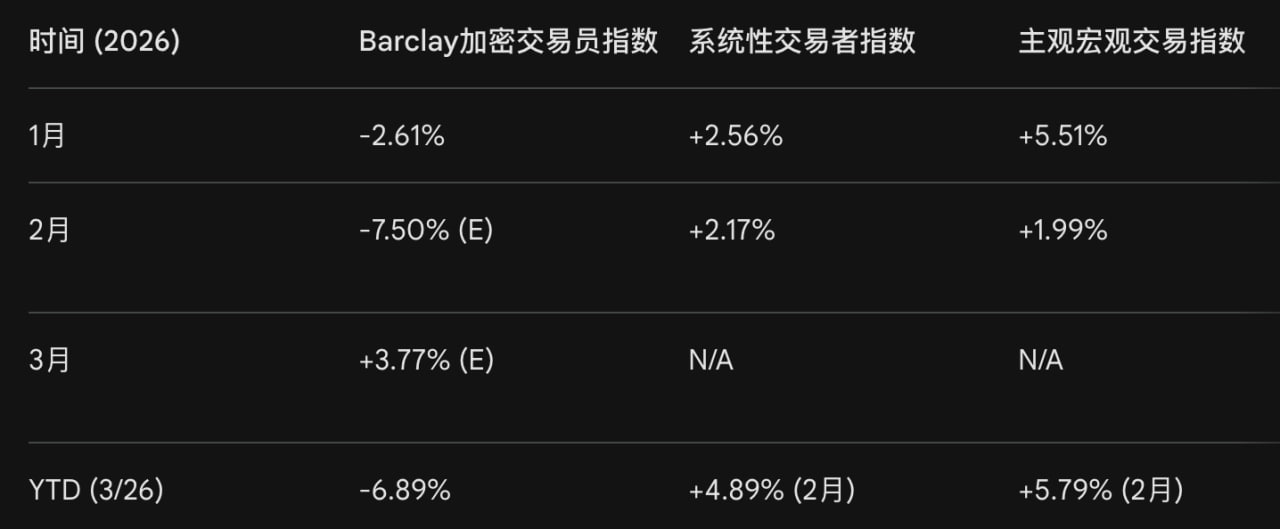进入2026年1月,市场呈现出初步的企稳迹象。Barclay CTA指数在2026年开年上涨了2.63%,而MPI Barclay精英系统性交易者指数(捕捉前20大系统性交易者的表现)更是上涨了3.56%,创下2024年12月以来的最佳单月表现 。然而,加密领域依然表现落后,Barclay加密货币交易员指数在2026年1月下跌了2.61%,2月跌幅扩大至7.50% 。