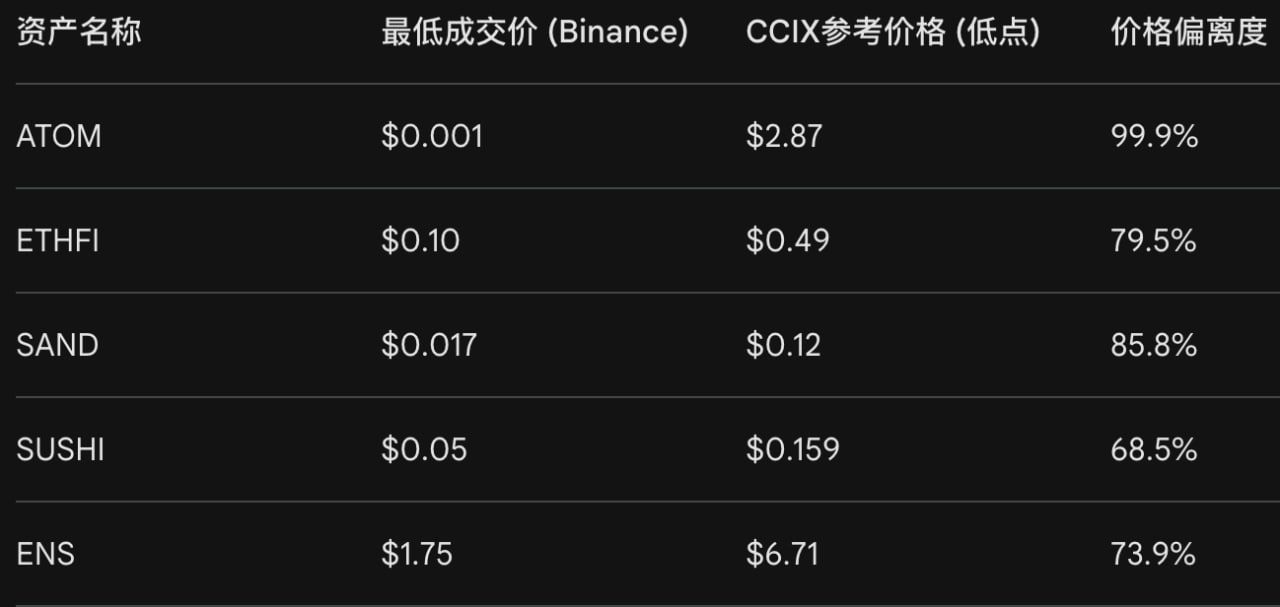 交易所之间的价格偏离(Price Deviation)也达到了荒谬的程度。在Binance等平台上,部分代币如ATOM和ETHFI甚至出现了接近归零的瞬间成交价(ATOM触及0.001美元),而此时代表市场公允价值的CCIX指数价格仍维持在2.87美元左右 。这表明,在极端压力下,传统的“一价定律”在加密市场完全失效,基于单一交易所喂价的止损算法在此时可能导致毁灭性的滑点损失。