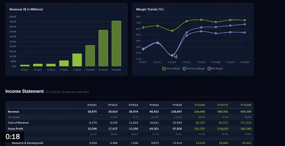 返回结果是:一个实时交互式仪表盘,包含 1305 亿美元营收、75% 毛利率、114.2% 增长率、完整利润表,以及从 2021 财年到 2028 年预测的利润率趋势,全部支持筛选和分享链接。