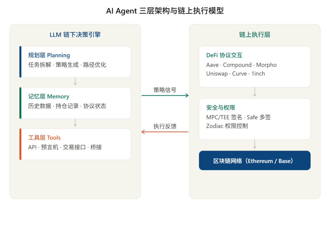 但这里有一点需要明确:AI 模型本身无法直接与区块链交互。几乎所有当前的 DeFAI 系统,都采用链下推理与链上执行分离的架构——AI Agent 在链下完成策略计算,再将结果转化为链上交易信号,由执行模块代为提交。这一架构设计,既是当前技术条件下的现实选择,也由此引出了私钥授权、权限管理等一系列安全议题(详见第五章)。