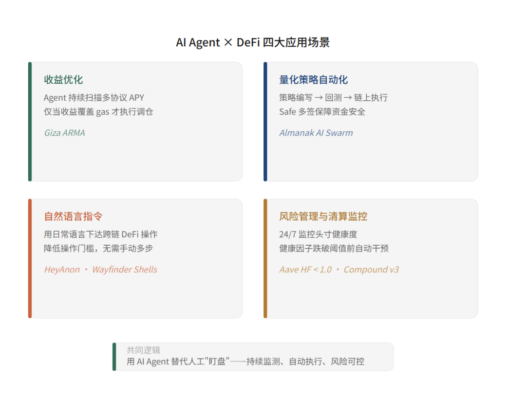 • 四大主流应用场景包括:收益优化(自动跨协议调仓)、量化策略自动化(机构能力平民化)、自然语言指令执行(降低操作门槛)、风险管理(实时监控清算风险)。