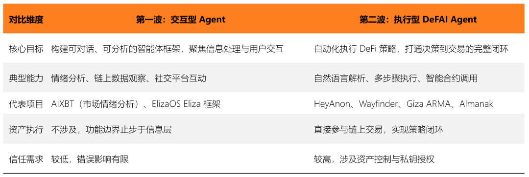 • 演进分为两阶段:早期交互型Agent(如ElizaOS)处理信息,当前执行型Agent(如Giza、HeyAnon)直接执行资产操作,区别在于是否触碰资产。
