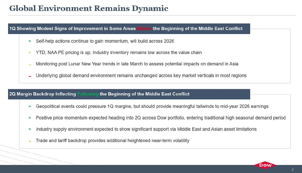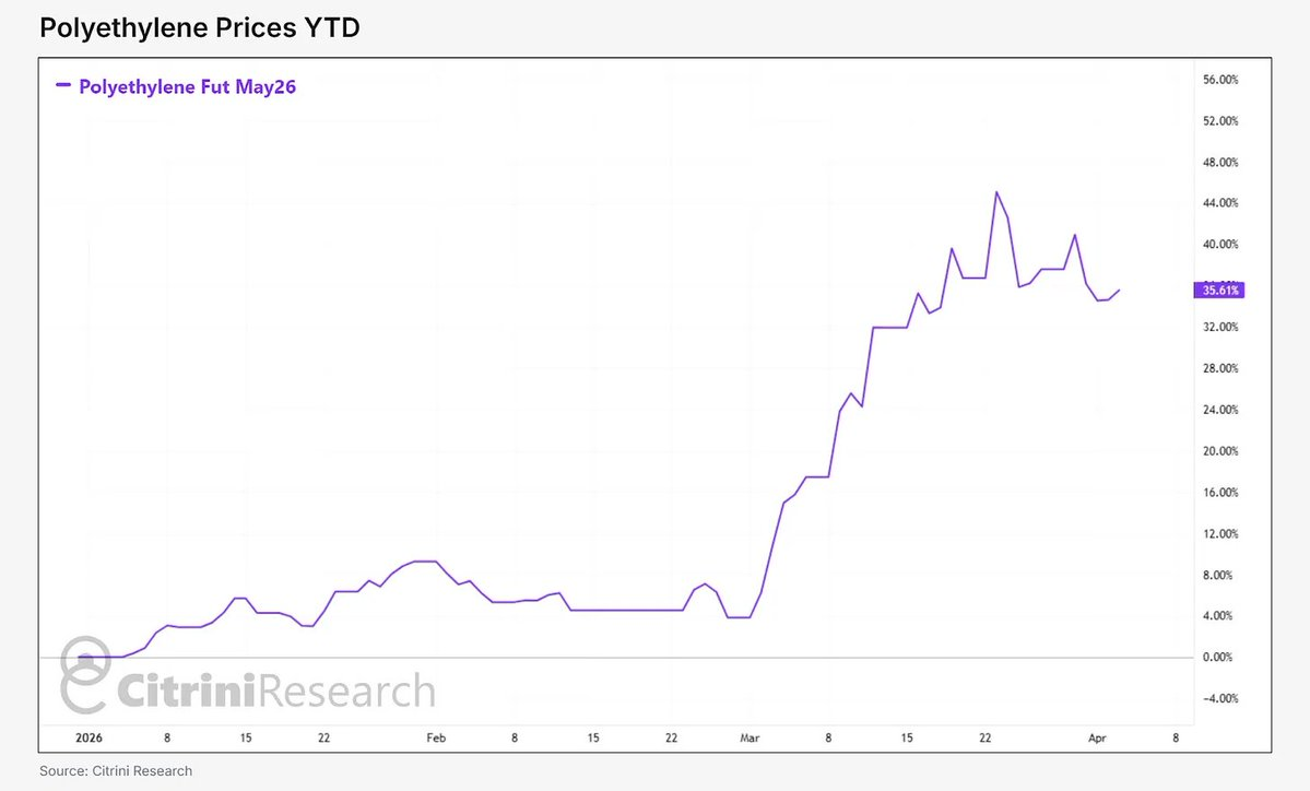 "在中东冲突开始之前,我们在第一季度已经开始看到市场改善的迹象。现在,定价行动和供应动态以非常快速和建设性的步伐演变……在三月份,我们已经在每个地区的每个业务中宣布了价格上涨……全球物流变得不确定,中东事件发生后,多达 50% 的聚乙烯供应要么离线、受限,要么受到影响。此外,整个价值链的库存水平历史性地低。"——陶氏 CEO 詹姆斯·菲特林,2026 年 3 月 18 日