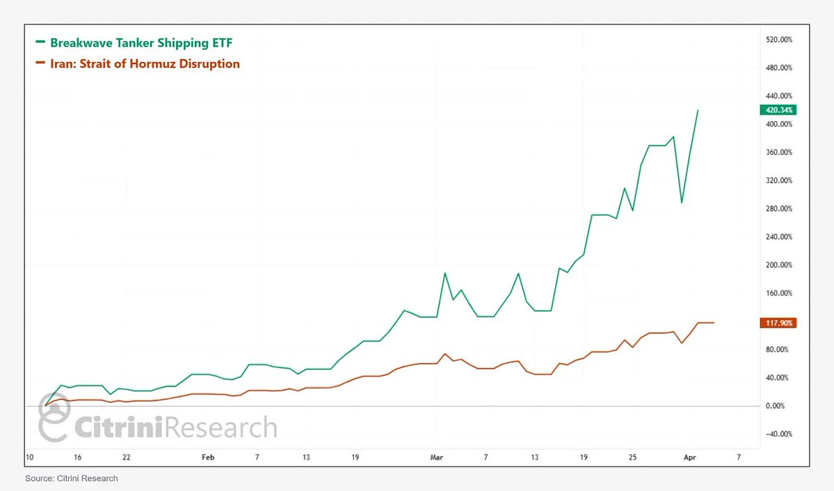我们认为油轮尚未见顶。在几乎所有情景下,我们都看到运费持续高企。即使海峡明天完全开放,油轮公司也可能继续印钞。尽管如此,不可否认的是,随着这些标的积累的动能(BWET 已上涨超过四倍),短期内将出现更高的波动性,它们将随着头条新闻交易,独立于其长期前景之外。